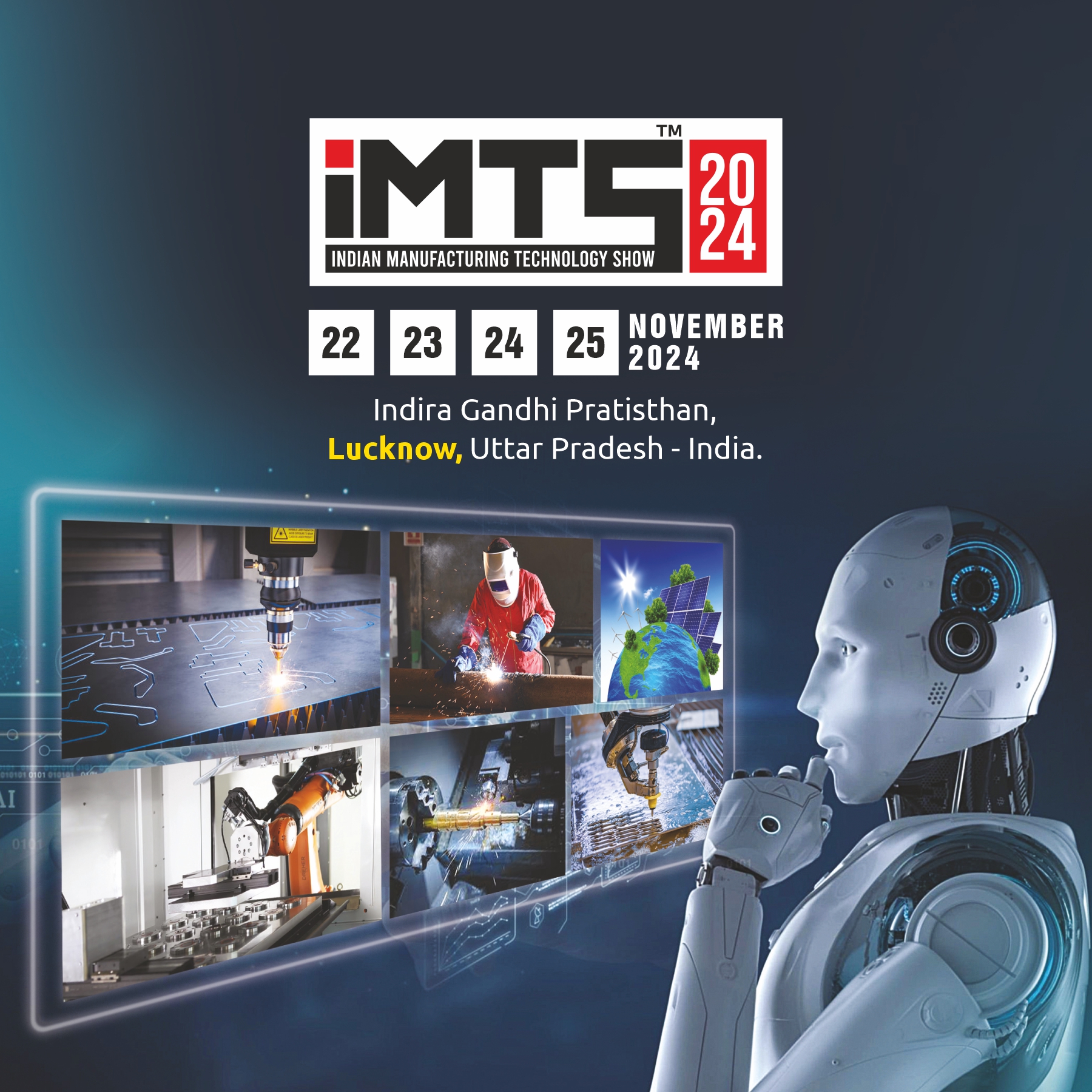 IMTS - 2024 Lucknow, having concurrent show on Machine Tools and Automation & Robotics will showcase the entire segment of Engineering Machinery, Machine Tools, Automation & Robotics, Instrumentation & Controls, Electrical & Electronics, Material Handling Equipment, Power/ Energy. IMTS is strategic forum for Participant that will put in touch with your customers from across India and Overseas market and learn about the latest industry trends, technologies and products from Industry Experts.